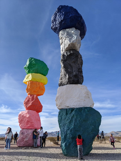 스트립에서는 많이 내려와야하는 세븐 매직 마운틴입니다. 원래 안가려고 했는데, 아이의 낮잠 시간을 제대로 못 맞춰서 얼떨결에 점심먹고 이 곳까지 와버렸습니다. 입구에 주차장이 꽤 넓구요. 입장료는 따로 없습니다. 임시로 세워진 작품이라.. 편의 시설은 없습니다. 아주 조그만 음료를 파는 푸드 트럭이랑 간이 화장실있구요. 간이 화장실은 푸드 트럭 소유인것 같아요. 잠겨있었어요. 그거 보고 ... 급한 사람은 음료를 살 수 밖에 없겠구만 했어요.