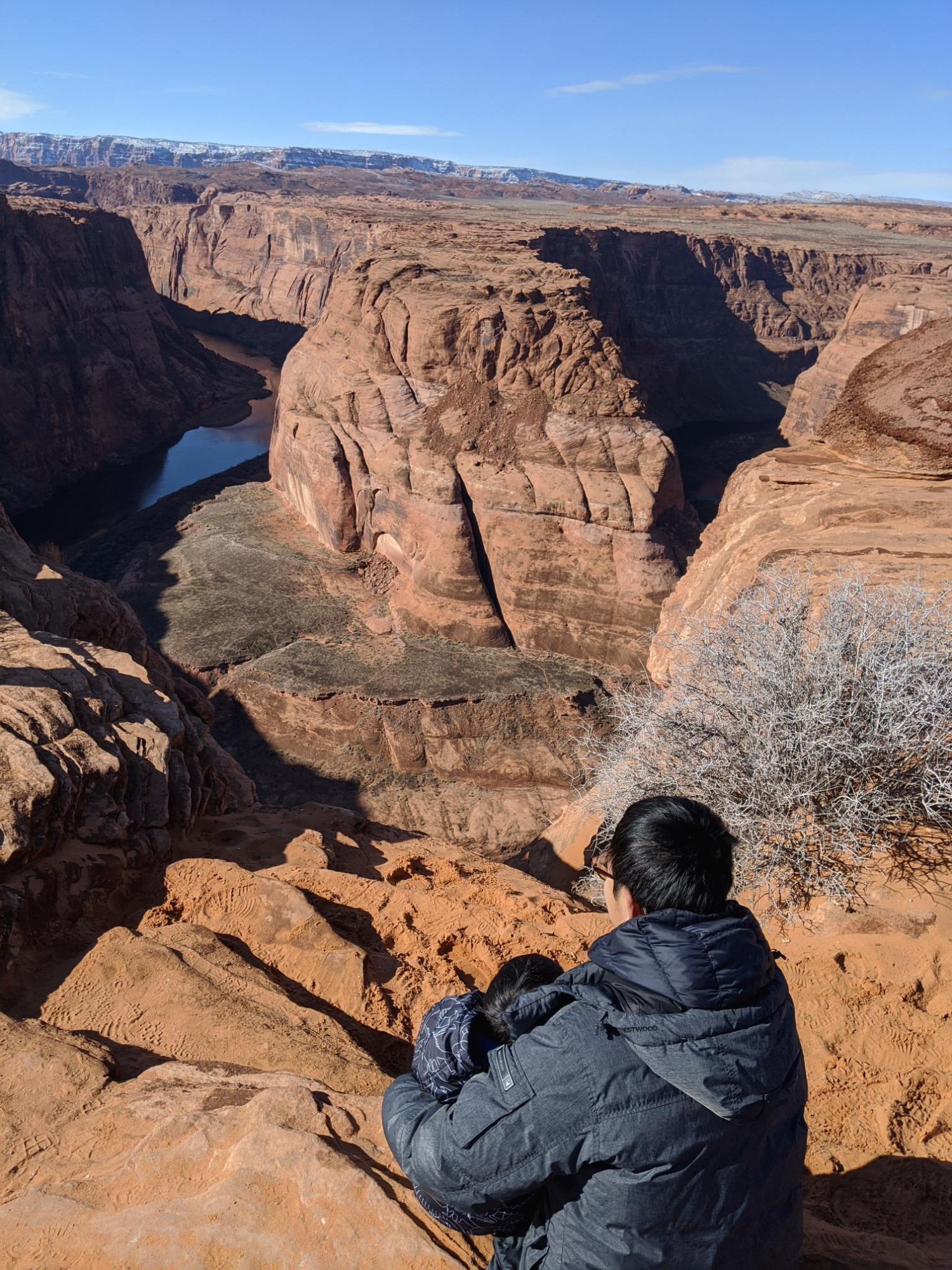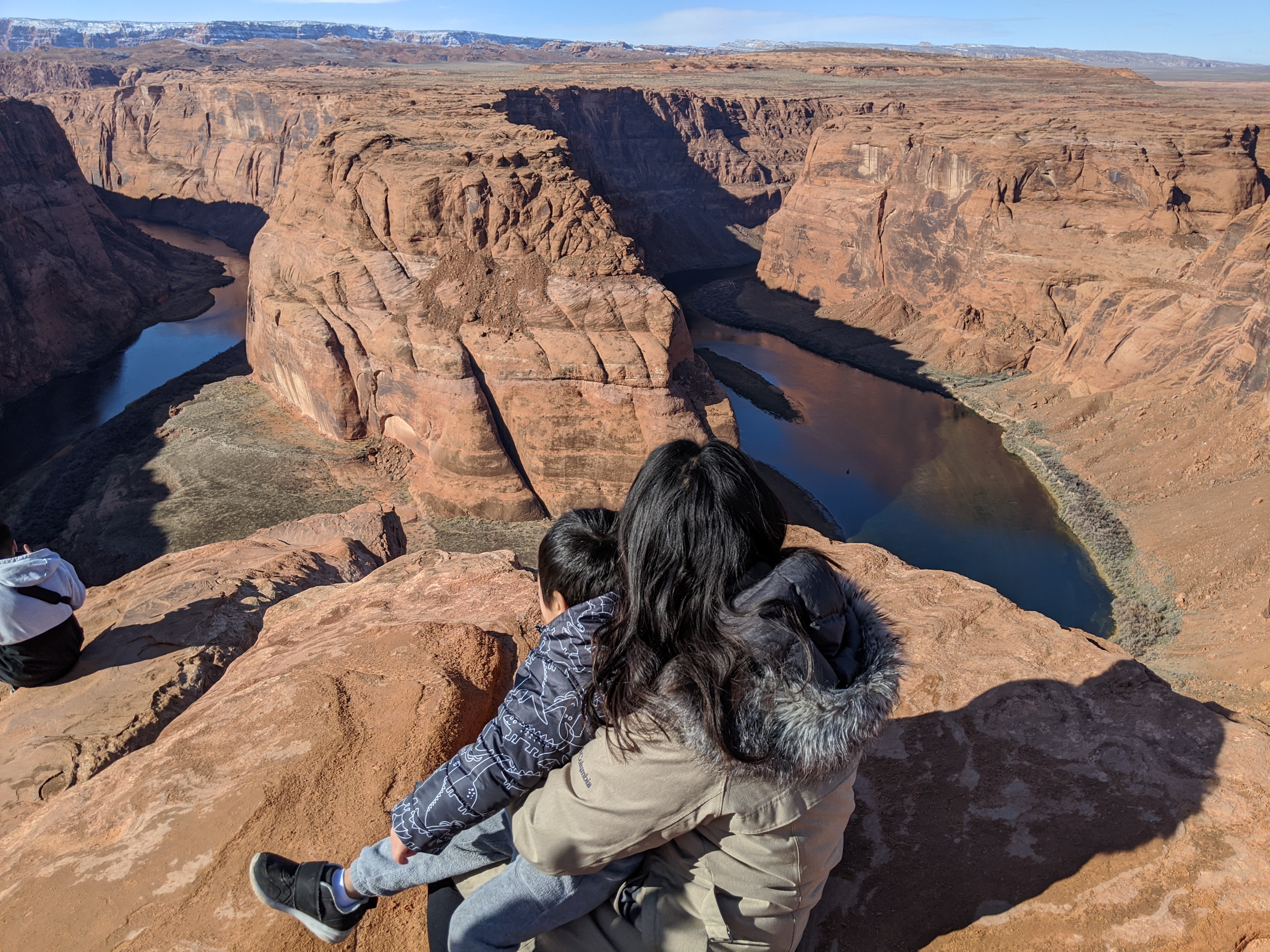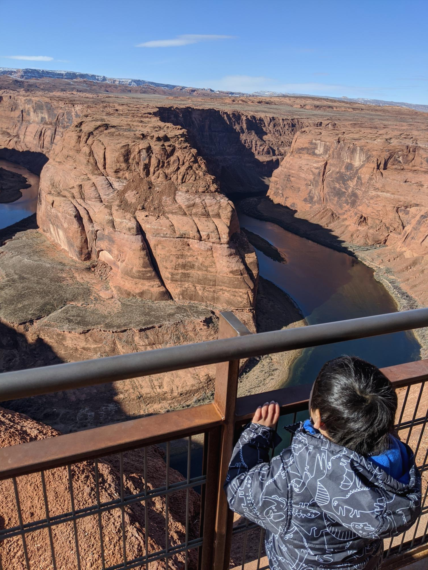 전체 일정 중, 가장 신경이 많이 쓰였던 홀슈밴드입니다. 저희가 방문했을 때, 그랜드 캐년 추락사고가 있은지 얼마 안되어서 참 걱정이 많이 되었어요. 일단 홀슈밴드 주차장에서 홀슈밴드까지 꽤 걸어야하는데요. 유모차를 들고 가서 끌고 다녔어요. 길이 좀 험한 부분은 걷게 했구요. 다행히 겨울이라 여름처럼 힘들지는 않았고 다녀올만 했습니다.